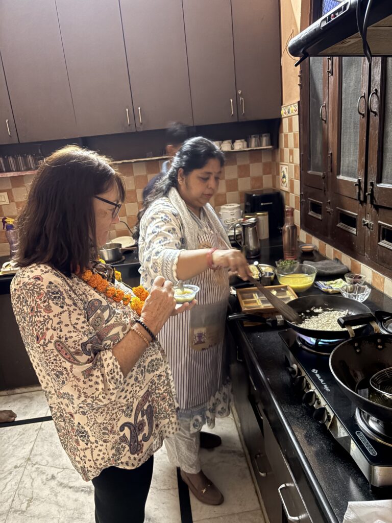 The group met up on the roof garden where the guys had been sharing some Kingfisher beers then Dot and I left in a tuktuk to make our way to a family about half an hour away for our Indian cookery lesson. It was a very bumby and busy ride through the rush hour.
